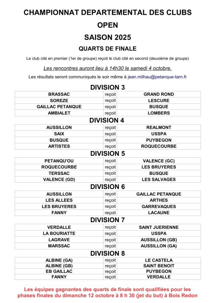 • CHAMPIONNAT DEPARTEMENTAL DES CLUBS OPEN QUARTS DE FINALES