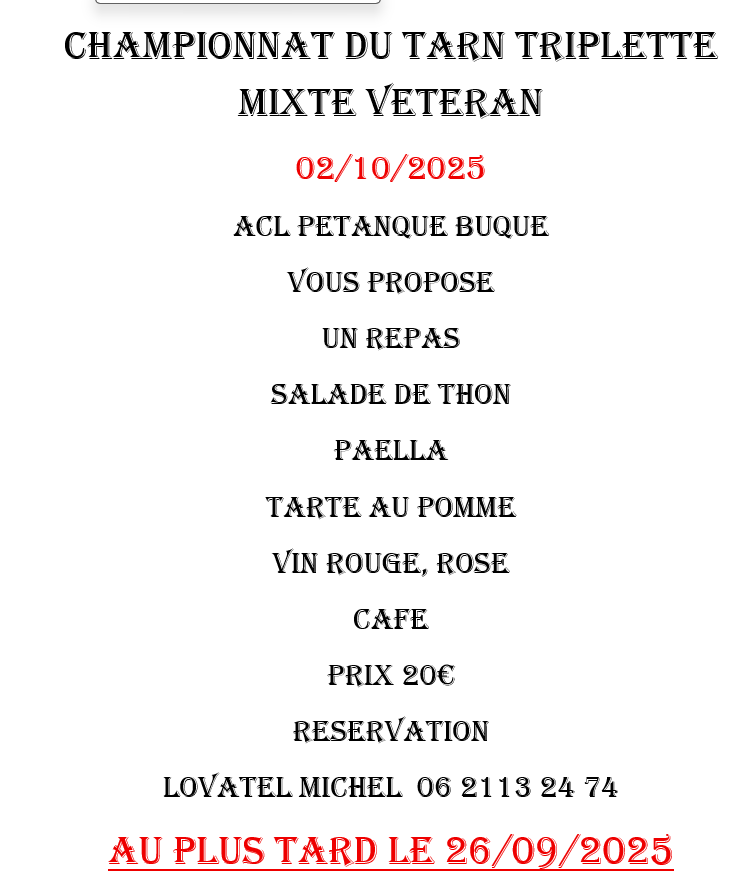 Le club de Busque organise le 2 octobre 2025 le Championnat Triplette Mixte Vétéran et vous propose le menu suivant: